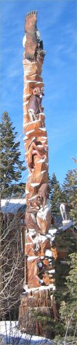 From the top down, there is a pair of eagles & nest, a longhorn sheep, a squaw,
